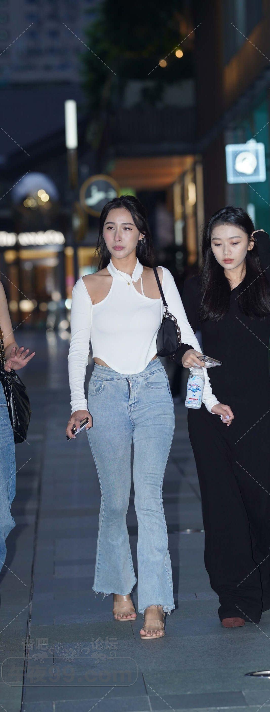 白色长袖紧身牛仔裤美女商场乘坐扶梯逛店【10P】